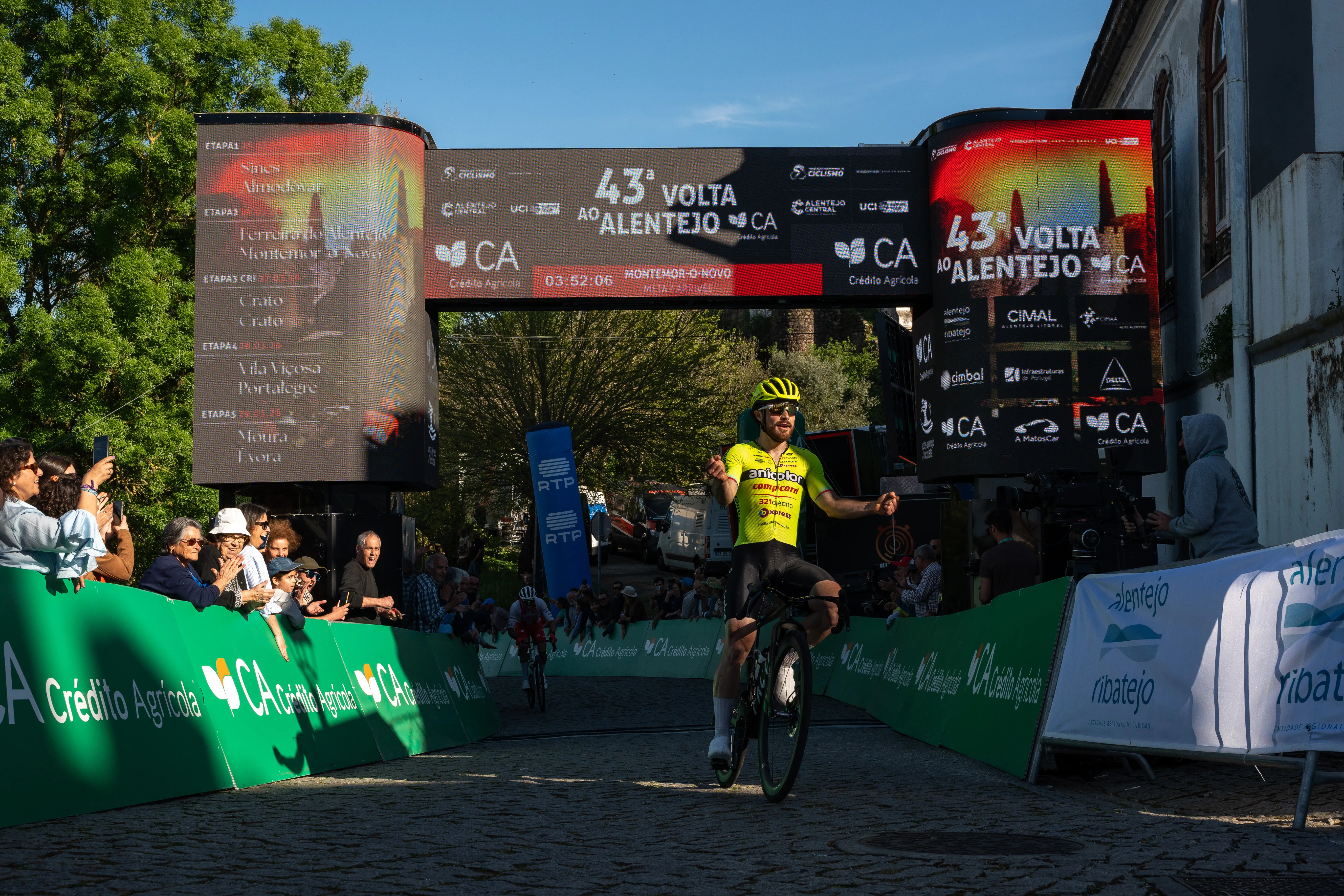 Santi Mesa triunfou na chegada ao Castelo de Montemor-o-Novo na quinta-feira e assumiu assim a Camisola Amarela – Crédito Agrícola, mas logo fez questão de lembrar que não é especialista no esforço individual, pelo que é provável que a liderança da Geral volte a mudar pelo segundo dia consecutivo na “Alentejana”.